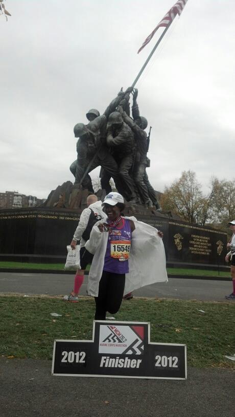 So here we go, Sunday morning. I woke up in a tizzy. I had no idea what to wear!! The meteorologists essentially were all saying different things. Chances of rain early. Hurricane Sandy would not arrive until that afternoon. Hurricane Sandy would not arrive until that night. Hurricane Sandy decided she needed a vacation and decided to hang out in the Atlantic a little while longer. Talk about lost. I checked the temp on my phone and it said 61 degrees. Huh? At 5am? Really? Thinking maybe it had not refreshed itself, I refreshed it and it said 62. Grrrrrrrrreat!! Now I was really lost. I got tired of staring at all my stuff so I went with my gut feeling…leggings, long sleeve poly tee and my race day TNT singlet. I would carry my fuel belt which allowed me to stash a poncho and I would wear my TNT hat. I decided against sunglasses since it was cloudy outside and I assumed Little Miss Sunshine would not show her face that day. So after partaking in my hearty breakfast that consisted of a blueberry muffin and a banana, I met my teammates downstairs to take pictures and head to the Metro. I step outside of the hotel and it was WARM!! I was thinking in my head, “you can not be serious. I am going to roast in these leggings.” When we got off the Metro at the Pentagon, my legs were thanking me. It was like 15 degrees colder at the Pentagon. DC weather man! So off we go to find a spot to relax in before we head to the start. I am taking in all the sites and sounds….the people, the music, the Marines(whom I took pics with), the long lines at the Porta Potties, the Marine flyover. I was doing everything I could to get rid of the anxiousness I was feeling and then it happened. I do not like to put my running shoes on until I absolutely have to. That morning I was wearing flip flops and I had my shoes and socks in a bag. At some point, the water from one of my water bottles leaked and my socks got soaked!! NOOOOOOOOOOOOOO!!! I could not believe it. I am not sure if you all understand how important a runners socks are to them. I had to have these socks to wear because they were the ones that prevented me from blistering on my feet. There was no way I could run in them though so I had to settle for my backup pair. Squirrels(you know how people says rats when they are bummed about something, I say squirrels).