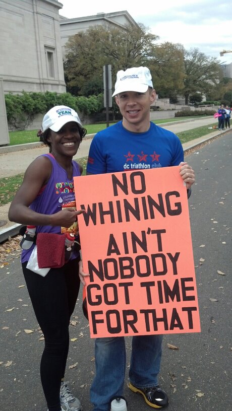 So while I would have loved to have a dry pair of socks that I wanted to run in, I had to get focused on the task ahead. So I sucked it up, put on my dry socks, said a prayer and off I went. I officially started the race at 8:05, 10 minutes after the gun went off. I started chugging along. I was chugging along so good the first two miles that I did not even see the mile markers. I do not know what it is about mile three in the MCM but I started having trouble. In 2010, my IT band started hurting. This year, I started getting hot. I was burning up!! It was in the upper 50s but I felt like I was running in 80 degree heat. I had to make a decision quick. Do I keep running in this long sleeve shirt or do I toss it even though it is cool outside?I After I dodged some roadkill(still not sure what it was but it was HUGE), I decided to lose the shirt. I really hated to part with it because it was one of my favorite running shirts but I would not make it to the end in that thing. I chucked it and continued to chug along. Miles four, five, six, seven, eight. I was making good time. Approaching mile nine we entered into one of my favorite sections of the race M Street in Georgetowne. The people there are amazing! There are bands, kids with signs, people handing out snacks and water, just an all around fun time. Miles 10 and 11 were one word, WINDY!! The breeze coming off the Potomac River made me wish I still had that shirt. I could not focus on that though so I kept taking in the sights and sounds. Mile 12 is when everything shifted. I was hongry! Not hungry. Hongry!! I knew I would not see my Coach Elaine until mile 17 so I did something I had been doing throughout the race, I begin to pray. I needed strength to make it to mile 17 because at that point if someone had offered me a T-bone steak, I would have demolished it. So I kept chugging. I caught up with some Team in Training ladies from South Carolina, one was a fellow NC State alum, who made miles 12-13 seem a lot easier. We chugged along together. Miles 14, 15. Still chugging and then mile 16 came with a pleasant surprise, Elaine!! She was early and I was definitely glad to see her. Food at last!!